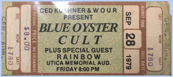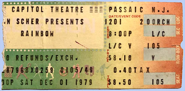Ticket Stubs 1975 1976 1977 1978 1979 1980 1981 1982 1983 1984 1995 1996 1997 2016 2017 2018 2019 1979 September 18 - Veteran's Memorial Coliseum, New Haven CT, USA [support act for Blue Oyster Cult] ![]() ![]() ![]() ![]() September 19 - Civic Center, Glens Falls NY, USA [support act for Blue Oyster Cult] ![]() ![]() ![]() ![]() ![]() ![]() September 20 - War Memorial Auditorium, Rochester NY, USA [support act for Blue Oyster Cult] ![]() ![]() ![]() ![]() September 21 - Cobo Arena, Detroit MI, USA [support act for Blue Oyster Cult] ![]() ![]() ![]() ![]() ![]() ![]() ![]() ![]() September 22 - Civic Center, Lansing MI, USA [support act for Blue Oyster Cult] ![]() ![]() September 27 - Erie County Field House, Erie PA, USA [support act for Blue Oyster Cult] ![]() ![]() ![]() ![]() ![]() ![]() ![]() September 28 - Memorial Auditorium, Utica NY, USA [support act for Blue Oyster Cult] ![]() ![]() ![]() September 29 - Spectrum, Philadelphia PA, USA [support act for Blue Oyster Cult] ![]() ![]() ![]() ![]() ![]() ![]() ![]() September 30 - Civic Center, Baltimore MA, USA [support act for Blue Oyster Cult] ![]() ![]() ![]() ![]() ![]() October 2 - Veterans Memorial Hall, Columbus OH, USA [support act for Blue Oyster Cult] ![]() ![]() ![]() ![]() ![]() ![]() October 3 - Wendler Arena, Saginaw MI, USA [support act for Blue Oyster Cult] ![]() ![]() October 4 - War Memorial Auditorium, Buffalo NY, USA [support act for Blue Oyster Cult] ![]() ![]() ![]() ![]() ![]() ![]() ![]() October 5 - Civic Arena, Pittsburgh PA, USA [support act for Blue Oyster Cult] ![]() ![]() ![]() ![]() October 6 - Hara Arena, Dayton OH, USA [support act for Blue Oyster Cult] ![]() ![]() ![]() ![]() ![]() ![]() October 7 - Richfield Coliseum, Cleveland OH, USA [support act for Blue Oyster Cult] ![]() ![]() ![]() October 10 - Dane County Memorial Coliseum, Madison WI, USA [support act for Blue Oyster Cult] ![]() ![]() ![]() ![]() ![]() October 12 - International Amphitheatre, Chicago IL, USA [support act for Blue Oyster Cult] ![]() ![]() ![]() ![]() ![]() October 13 - Civic Auditorium, Omaha NE, USA [Rainbow cancelled due to illness in the band] ![]() ![]() ![]() ![]() ![]() October 14 - Hammons Center, Springfield MO, USA [Rainbow cancelled due to illness in the band] ![]() ![]() ![]() ![]() October 16 - Wings Stadium, Kalamazoo MI, USA [Rainbow cancelled, no replacement] ![]() ![]() October 18 - Market Square Arena, Indianapolis IN, USA [Rainbow cancelled and replaced by The Hounds] ![]() ![]() ![]() ![]() ![]() ![]() ![]() October 20 - Freedom Hall Civic Center, Johnson City TN, USA [Rainbow cancelled and replaced by Robert Palmer] ![]() ![]() ![]() October 24 - The Armory, Springfield IL, USA [support act for Blue Oyster Cult - Rainbow replaced by Pat Travers] ![]() ![]() ![]() October 26 - Met Center, Minneapolis MN, USA [Final date of this tour but Rainbow didn't play instead the Machine Head album was played through the PA in its entirety] ![]() ![]() November 6 - Civic Auditorium, Santa Cruz CA, USA ![]() ![]() ![]() November 7 - Auditorium Arena, Oakland CA, USA ![]() ![]() ![]() November 9 - Swing Auditorium, San Bernardino CA, USA ![]() ![]() ![]() ![]() November 10 - Fox Theater, San Diego CA, USA ![]() ![]() November 11 - Long Beach Arena, Los Angeles CA, USA ![]() ![]() November 13 - Warnors Theatre, Fresno CA, USA ![]() ![]() ![]() November 16 - Rainbow Music Hall, Denver CO, USA ![]() ![]() November 19 - Music Theatre, Royal Oak MI, USA ![]() ![]() ![]() ![]() November 23 - Beacon Theatre, New York City NY, USA ![]() ![]() ![]() ![]() ![]() ![]() ![]() November 27 - War Memorial Auditorium, Worcester MA, USA ![]() ![]() November 30 - Calderone Concert Hall, Hempstead NY, USA ![]() ![]() ![]() December 1 - Capitol Theater, Passaic NJ, USA ![]() ![]() ![]() ![]() ![]() ![]() ![]() December 7 - Ocean State Performing Arts Centre, Providence RI, USA ![]() ![]() December 8 - Landmark Theatre, Syracuse NY, USA ![]() ![]() ![]() December 9 - Palace Theater, Albany NY, USA ![]() ![]() ![]() December 11 - Music Theatre, Royal Oak MI, USA [rescheduled from November 20] ![]() ![]() ![]() ![]() ![]() ![]() ![]() December 12 - Music Theatre, Royal Oak MI, USA [rescheduled from November 21] ![]() ![]() ![]() ![]() ![]() December 13 - Stanley Theater, Pittsburgh PA, USA [rescheduled from December 4] ![]() ![]() ![]() ![]() ![]() ![]() |