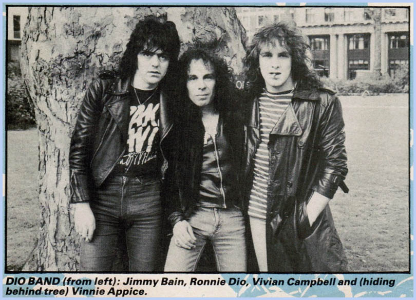 John McCoy feature), the way has been left clear for his pretentious/distinctive grandscale style, a mystical, mind-at-work tack best described as... Dioesque.What this means in hard listening terms I'll touch on later; for the moment, suffice it to say that a Dio melody is seldom short of epic, and a Dio lyric rarely concerned with the standard booze/birds/backstage aspects of the rock'n'roll lifestyle. His is a more magnanimous approach - nothing to do with Heavy Metal and its numbskull implications, he insists - reflected over the years in the material he's helped craft. With Rainbow, the likes of Starstruck', 'Kill The King', 'Gates Of Babylon' and, of course, 'Stargazer' (greatest heavy rock number of all time, etc.), and with Sabbath 'Neon Knights', 'Voodoo', 'Children Of The Sea' and 'Heaven And Hell'. Not bad, eh? And there's more to come... to this list of combustibles can now be added such fresh, though soon to be familiar, titles as 'Holy Diver', 'Invisible', 'Rainbow In The Dark' and 'Shame On The Night', the four prime cuts from Dio's new 'Holy Diver' album, the finest of the man's career. Oh dear. I can see early Rainbow fans shaking their heads, copies of 'Rising' held flush with heaving flesh. But I can assure such outraged parties that this particular conclusion was not arrived at lightly, being the end result of many midnight hours of trial and analysis. With a full moon shining overhead and buckets of dry-ice placed strategically around the turntable, the records in question - separated by a seven year span, remember - were spun back to back, my notes informing me that, while 'Rising' proved hard to beat on the 'spinal reaction' front, in terms of production, vocal prowess and unity of purpose, it was 'Dio' all the way. Some pundits felt that the latter opus would simply be a showcase for the wee man's ego, familiar flights of fantasy propped up no more than adequately by hired session hands. But it's plain from the off that what we have here is a genuine band - a group of lively, talented musicians willing to play under the 'Dio' banner yet in no way stifled, subdued or secondary. On drums there's Vinnie Appice, formerly of course with Sabbath, on bass/occasional keyboards Jimmy Bain, an old Rainbow pal of Ronnie's last seen with Wild Horses, Phil Lynott and The Scorpions, and on guitar Vivian Campbell, a 21 year old from Belfast, confident in his own ability and determined to keep a goodly distance from all combos suffering the plague-like scourge of (Eddie Van) Halitosis.