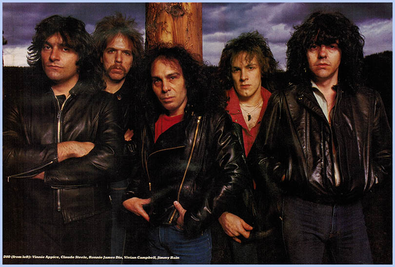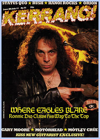 YAY! YAY! Wilcom! Wilcom! Und now das is der Heavy Metal Bimbo - DIO!"I'll be damned if I know what a 'Heavy Metal Bimbo' is, but that rap is coming from the cake 'ole of a manic Dutchman standing up there onstage bellowing away in his native language - and he seems to know exactly what he's talking about. So do the crowd down on ground level, who respond to this ridiculous introduction with the restraint of a pack of rabid Dobermans on the heels of an escaped POW. Taking up the somewhat unpredictable chant of "Dio! Dio! Dio!", these kamikaze clogwearers suddenly hurl themselves forward in order to catch a glimpse of their idol. Security springs into action, Netherlander muscle men calmly approaching the tall, tough steel fence and sending climbing transgressors hurtling back into the seething throng with a firm shove and a malicious smile on the lips. It's like being at some overpopulated, demented human zoo, I reflect as I turn to look at the slavering Hollandic horde penned in behind me. Eyes glazed and glinting with feverish fury, mouths wide open and spraying spittle, these tulip-growing gonzos are behaving like animals plucked straight from the wild to spend their first night behind the bars of a cage. I've got to admit, I'm more than a little frightened; given a choice, at this precise moment I'd much rather be at Chessington ogling the p-p-p-penguins! But no - instead I'm here in Flat Land to attend the Pink Pop Festival with the specific intention of checkin' out and talkin' to Ronnie James and his disciples. The Dutch have been holding this outdoor event for years now and they really have got the whole thing down to a fine art. In comparison to the chaos of Poperinge, this flesh-toned spectacular is an organisational dream - twin Reading-style stages, near perfect sound, barely 15 minutes between acts, some of the best backstage facilities known to mankind and NO MUD combine to make life pretty comfortable for press and public alike, bestial barricade-breakin' bozos behind me notwithstanding. The bill, I'm not so sure about. 'Dance Hall Days' dullards Wang Chung opened the proceedings around 11 am, to be followed by Marillion, John Hiatt, the Pretenders and then Dio. Later in the day the show is due to be rounded off by Billy Bragg, Big Country and finally headlining reggae artist Jimmy Cliff. A weird selection, eh chums? But the frying Dutchmen (it's a beautifully hot and sunny day) out front seem perfectly content and open-minded enough to accept this musical melange. That said, however, the reception garnered by Chrissie Hynde's crew, Dio's direct predecessors, was as nothing compared to the wild scenes currently goin on about me. Dio's definitely the success of the fest so far, and it's not difficult to see why. Beginning with 'Stand Up And Shout', roaring musical expertise and Ronnie's amiable-but-awesome persona make for a killer concoction: quietly, calmly, with little fuss but expert timing, this lot have crept up the loudness lot have crept up the loudness ladder to become what we in the trade term 'a major band'. Decked out as usual in the height of sartorial elegance (moth-eaten T-shirt emblazoned with chintzy sequinned cross, tattered remains of kitchen mop tied around waist, interesting selection of colourful handkerchiefs attached to ankles) the diminutive Ronald Padavona takes command from the off, exuding warmth and charisma as he warbles some of Metal's most magical, mystical lyrics. To Dio's right, guitar-hero-in-the-making Vivian Campbell bobs and weaves and dices with danger as he dances on the edge of the towering stage - the potential prospect of seeing a young and gifted Irishman splattenng on to concrete from a height of 25 feet certainly adds spice to the proceedings! In direct contrast, bass player Jimmy Bain keeps well away from the front of the platform. Looking decidedly uncomfortable in the glaring light of day, his eyes so sort-wed up they could well be tightly closed, it's obvious that he doesn't trust himself enough not to end up as a Scot on the rocks. His playing is unimpaired however, and after a career with more ups 'n' downs than a camel convention it's obvious that he relishes resuming his role in a big, breaking band; being back on top instead of languishing in equine decline. With Vinnie Appice thumping the tubs and is-he-or-isn't-he keyboard player Claude Steele adding the occasional dramatic fill, Dio's hour-long set simply flashes by, hitting hard and hitting low, old Sabs/Rainbow faves like 'Lady Starstruck', 'Stargazer' and 'Heaven And Hell' rubbing shoulders with new album tasters 'One Night In The City' and soon-come classic 'We Rock'. Throughout the set Dio takes the utmost care and attention to involve the massive crowd, repeatedly commenting on the abundant banners and standing back and more or less allowing them to get on with singing the words to 'Man On The Silver Mountain'. And his 'duty' to the fans doesn't stop at the end of the show, either. After storming renditions of 'Holy Mackerel' and the encore 'Don't Talk To Strangers', Dio leaves the stage to tumultuous applause and makes his way back to the dressing room. Halfway there, he notices two fans who've fought their way through tangled undergrowth and are standing behind barbed wire, looking down on the backstage area. They haven't noticed him and they're calling, plaintively and rather pathetically, "Dio... Dio... Dio..." Ronnie makes the point of stopping in his tracks and attracting their attention. "Hello! Thank you!" he cries, waving. It needn't have happened, but Ronnie James Dio, der Heavy Metal Bimbo, has just made two people's days... So strage, therefore, that in his interviews - which are read by his fans, after all - Ronnie Dio should choose to display a darker side to his nature. You don't notice it at the time you're talking to him, but when you come to transcribe the tape RJD really does come across as terribly arrogant, ego-obsessed and condescending. T