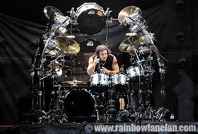 Waldrock that is only one day plus a pre-party the night before with 4 bands (Dragonforce, Napalm Death and 2 Dutch bands) still is a very fine festival. Great relaxed atmosphere, maybe not as professional as the other big festivals but then again that's also the charm of this event.It was going to be a long day. The first band kicked off at noon. Local metallers Disintegrate had the honour to play their melodic death/thrash metal in their own area. Nice way to start the day. Other bands followed divided on the two stages including Dutch female fronted metal acts Delain & Epica, Papa Roach, Voivod, Trivium and Killswitch Engine. Most striking were the covers by Voivod (Pink Floyd's "Astronomy Domine") and Killswitch Engine who had a go at Dio's "Holy Diver". Needless to say the singer sounded a lot worse than Ronnie James Dio. After Papa Roach ended their rockin' set of nu-metal it was time for Lemmy and his companions. For those who perhaps would not know them Lemmy was very clear as he started with "We are Motörhead and we play rock 'n' roll!" in his typical rough voice. They kicked off with a loud version of "Iron Fist". And all the other well known Motorhead hits followed. And yes, they were bloody loud as usual. Before Heaven and Hell would enter the stage we first got goregrind & death metal by Carcass on the second stage. Then just after 11 PM the intro of E5150 started. Vinnie Appice got behind his enormous drumkit. Geezer Butler appeared on the left side of the stage, while riffmaster Tony Iommi took the right site and starts the "Mob Rules" riff. Then the little man with the huge voice entered the stage. There he is, Ronnie James Dio, and the man sings like we used from him. And many in the audience join in "You've nothing to say, they're breaking away, if you listen to fools... the mob rules!". ![]() The audience get a fine mix of songs from the four studio albums this band has recorded through the years. Three of those were under the monicker Black Sabbath. Next up is "Children of the Sea" followed by "I" from the Dehuminizer album. "Bible Black" is the first song from the new "The Devil You Know" CD. It fits perfect inbetween the older stuff.
