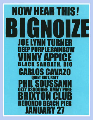 Big Noize Brixton South Bay, Redondo Beach, CA January 27, 2011 ![]() There was not much time for notice--the concert was happening in less than a month on a Thursday night. Nevertheless, using social networks like Facebook and Myspace, coupled with some old fashioned distribution of flyers, BIG NOIZE, the classic hard rock supergroup, featuring vocalist Joe Lynn Turner (Rainbow/Deep Purple/solo), bassist Phil Soussan (Ozzy Osbourne/Jimmy Page), guitarist Carlos Cavazo (Quiet Riot/Ratt), and drummer Vinny Appice (Heaven & Hell, Dio, Black Sabbath), along with Erik Norlander (Asia featuring John Payne) on keyboards, performed in front of a decent sized and enthusiastic crowd at Brixton South Bay. If you have not heard of it, this is a venue for national rock acts located on the Redondo Beach Pier, just steps from the Pacific Ocean.