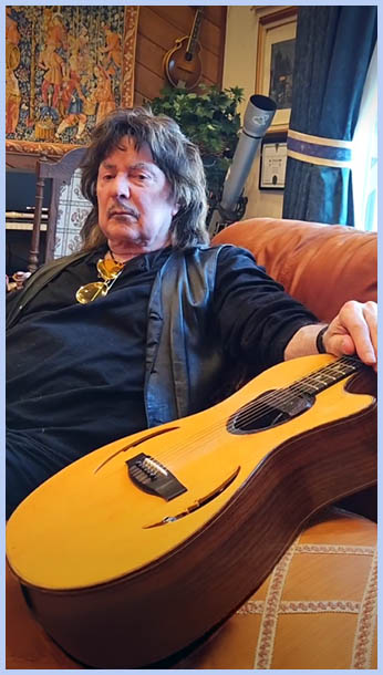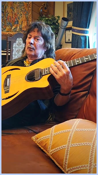 Ritchie Blackmore Livestream Birthday Interview with questions asked by fans ![]() What was your favorite solo with a Gibson? Probably Hush. We did that in two takes and the guitar was feeding back, which I liked because this is semi acoustic, which would feed back with the amplifier. And if you listen right in the beginning of the first four chords, then it feeds back. And I would say Hush because it was tricky to try and get in to playing parts. Somebody wanted to know if you would be coming to Germany again. Oh, I'm suffering from so many ailments. one is traveling and as much as obviously I love coming to Germany, I did since 1963 with Jerry Lee Lewis and I love the country and I've always loved the country and the people were very hardwork but they like to enjoy themselves at the same time. Plus the biggest musicians in the world have come from Germany. Bach, etc. Do you have any advice for a new guitarist? Yes, get a get a a lawyer immediately. ![]() Somebody else wants to know this the story behind this guitar you're holding. Oh, you can see it. Okay! This is a Lakewood made specially for me. I put a pickup in here. I wanted a small parlor guitar and I always I always like Martin Seeliger's Lakewoods. I've just got some two new ones, but I've had this probably 20 years, 30 years. He wants to know if that guitar is scalloped. No, not particularly. No, it's not. I just what I do instead of scalloping an acoustic, I make sure they're very big frets. Usually Gibson frets. I have them do a refretting job. And these are big frets, although they're probably Lakewood. Somebody's saying woolly bully. [laughter] Woolly bully traumatized me. I heard it for a year non-stop when I was living in Germany in Hamburg. And of course, when I first heard it, I hated it. But then I became to like it because it was so ridiculous, the song, and then I went to see them at the Starclub and obviously they'd never rehearsed before so they didn't know when they were starting or when they were stopping and I like that it was so off the cuff and natural. Obviously, they've never rehearsed the band. And as soon as you hear that chord, as soon as you hear that A7th, you know it's Woolly Bully. That is quite a feat. Really is. Speaking of feet, I have my feet. I'm not showing your feet.