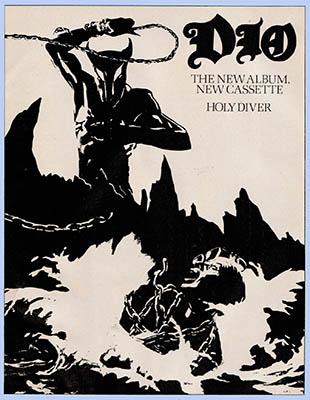 John McCoy feature), the way has been left clear for his pretentious/distinctive grandscale style, a mystical, mind-at-work tack best described as... Dioesque.What this means in hard listening terms I'll touch on later; for the moment, suffice it to say that a Dio melody is seldom short of epic, and a Dio lyric rarely concerned with the standard booze/birds/backstage aspects of the rock'n'roll lifestyle. His is a more magnanimous approach - nothing to do with Heavy Metal and its numbskull implications, he insists - reflected over the years in the material he's helped craft. With Rainbow, the likes of Starstruck', 'Kill The King', 'Gates Of Babylon' and, of course, 'Stargazer' (greatest heavy rock number of all time, etc.), and with Sabbath 'Neon Knights', 'Voodoo', 'Children Of The Sea' and 'Heaven And Hell'. Not bad, eh? And there's more to come... to this list of combustibles can now be added such fresh, though soon to be familiar, titles as 'Holy Diver', 'Invisible', 'Rainbow In The Dark' and 'Shame On The Night', the four prime cuts from Dio's new 'Holy Diver' album, the finest of the man's career. Oh dear. I can see early Rainbow fans shaking their heads, copies of 'Rising' held flush with heaving flesh. But I can assure such outraged parties that this particular conclusion was not arrived at lightly, being the end result of many midnight hours of trial and analysis. With a full moon shining overhead and buckets of dry-ice placed strategically around the turntable, the records in question - separated by a seven year span, remember - were spun back to back, my notes informing me that, while 'Rising' proved hard to beat on the 'spinal reaction' front, in terms of production, vocal prowess and unity of purpose, it was 'Dio' all the way. Some pundits felt that the latter opus would simply be a showcase for the wee man's ego, familiar flights of fantasy propped up no more than adequately by hired session hands. But it's plain from the off that what we have here is a genuine band - a group of lively, talented musicians willing to play under the 'Dio' banner yet in no way stifled, subdued or secondary. On drums there's Vinnie Appice, formerly of course with Sabbath, on bass/occasional keyboards Jimmy Bain, an old Rainbow pal of Ronnie's last seen with Wild Horses, Phil Lynott and The Scorpions, and on guitar Vivian Campbell, a 21 year old from Belfast, confident in his own ability and determined to keep a goodly distance from all combos suffering the plague-like scourge of (Eddie Van) Halitosis.
