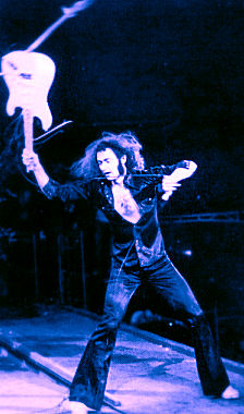 "Goedemorgen kinderen," zegt de meester. "Goedemorgen meester," zeggen de kinderen in de klas. De Meester: "Vandaag slaan we ons boekje open bij het jaartal 1963 en gaan we zien wat er in dat jaar is gebeurd."DE GESCHIEDENISLES Schoolmeester Sphritszsaft vertelt..... 1963: The Outlaws Het verhaal begint in 1961. Zanger Mike Berry wordt gekontrakteerd door producer Joe Meek. Berry had echter voor zijn optredens een begeleidingsgroep nodig. Via via werd deze gevonden in Billy Grey and the Stormers. Grey wordt aan de kant gezet en de groepsnaam veranderd in THE OUTLAWS. In deze eerste Outlaws-bezetting spelen Billy Kuy (solo-gitaar), Chas Hodges (basgitaar), Bob Graham (drums) en Reg Hawkins (slaggitaar), maar laatstgenoemde wordt al snel vervangen door de canadees Ken Lundgren. The Outlaws verzorgen niet alleen de begeleiding van Mike Berry en ook John Leyton, maar maken ook nog twee eigen singles en een LP. In hetzelfde jaar zit ook nog zanger Heinz Burt een poosje bij de groep, maar vertrekt al gauw naar The Tornadoes. De singles van The Outlaws zelf waren best verantwoord als je bedenkt dat de leeftijd van de heren tussen de 17 en 19 jaar lag. Het waren stuk voor stuk puike instrumentale werkjes, voor die tijd erg ruig en ongepolijst. Joe Meek gaf ze een zg. cowboy-look en bedacht de meest vreemde wild-west-titels als "Valley of the Sioux". Erg origineel was het niet, want naäpen van de Shadows ("Apache" en "Kon-tiki") lag er dik bovenop. ![]() Daarmee werd de bezetting: Ritchie Blackmore - sologitaar, Chas Hodges - basgitaar, Ken Lundgren - slaggitaar, Mick Underwood - drums. De eerste single die met Ritchie werd gemaakt, was "Return of the Outlaws" met op de b-kant "Texan Spiritual" in de zomer van 1963. Beide kanten waren instrumentaal en deden nogal denken aan "Telstar", een bekende deun uit die tijd, wat niet zo verbazingwekkend was omdat Meek ook die plaat had geproduceerd. De solo-gitaar speelt de melodie op beide kanten over een eenvoudige ondergrond. Bonkende paardenhoeven en geweerschoten openen de a-kant ('Outlaws' betekent 'vogelvrijverklaarden' - mochten deze mensen door de bevolking opgejaagd en mochten gedood worden zonder dat iemand daarvoor werd bestraft - outlaws waren vaak misdadigers). ![]() Hoewel Meek probeerde om de groep op eigen benen te laten draaien, gebruikte hij ze af en toe ook om anoniem te laten spelen op platen van anderen b.v. van Heinz Burt (feitelijk was het zo dat deze ex-Outlaws-man Ritchie vroeg om te spelen). Hoewel de groep geen verkoopsuksesen kende, kregen ze toch een beruchte naam door hun optredens. Verhalen deden de ronde van drumstellen die in het publiek terecht kwamen en dat ze een polonaise deden op de dansvloer waar mensen heel netjes een tango aan het dansen waren. Ze haalden zelfs de voorpagina van de krant "News of the world" toen ze rij wachtende buspassagiers vanuit hun busje bekogelden met poederzakjes. De eigenaar van het A.B.C. in Blackpool weigerde hen wegens "het gedrag van branieschoppers". De volgende single in 1963 was "Law and order", gekoppeld aan "Doo dah day", die beide uit een film, "Live it up" geheten, kwamen die rond Kerst zou worden uitgebracht. Er werd voor het eerst gezongen, alleen het is niet te achterhalen wie dat deed. Een volgende single kwam er al snel achteraan: "Set the Wild West free"/"Hobo, which was", die door Billy Fury in Melody Maker op 17 augustus werd omschreven als "It's a bit off, dreary" ("Dit zit er helemaal naast, verschrikkelijk"). De volgende single werd "Keep a knocking" met op de flipkant "Shake with me" is werd óf net voor óf net na Kerst 1963 uitgebracht. Ritchie verliet de groep in mei 1964 en werd opgevolgd door 'n zekere Harry Vincent, van wie verder niets te melden valt. Gene Vincent (geen familie?) had daarna de groep een poosje als begeleidingsgroep in 1964 en samen toerden ze door Engeland en Duitsland. Een lid van de R.B.A.S (zie eind van dit verhaal) heeft eens opgetreden in het voorprogramma van The Outlaws in Bristol. Hij kan zich de groep herinneren met Vincent, maar zegt niets te weten van Ritchie's aanwezigheid. Dit geeft al aan dat Ritchie toen al uit de groep was. Overigens had Gene Vincent al gauw genoeg van het gedrag van de groep en ontsloeg ze. Dit zelfde lid heeft zijn herinneringen eens nagezocht om iets meer van de groep te weten te komen. Chas Hodges, de bassist, speelde in sommige nummers ook pedal-steel-gitaar. Ritchie, die er op eerdere konserten wel bij was, speelde op een kersrode Gibson, waarschijnlijk waarop hij nog tot 1970 bij Deep Purple speelde (zie ook de hoes van "Concerto for group and orchestra"). Blijkbaar liet hij toen niets merken van de tegenwoordig zo duidelijk aanwezige zwaarmoedigheid. Hij was heel open en vriendelijk en ging zelfs zo ver dat hij buiten op de trappen van de zaal zijn gitaartechniek wel even wilde demonstreren aan belangstellenden. Zie je het voor je? De konserten bestonden voornamelijk uit de singles en wat klassieke rock-and-roll-nummers. Ritchie's bijnaam in die tijd was overigens BLUEBELL! Joe Meek, producer en baas van The Outlaws, gleed af in duisternis en pleegde later zelfmoord. ![]() Nog even een slotopmerking: de R.B.A.S. is de Ritchie Blackmore Association Society, die verantwoordelijk zijn voor deze informatie. "Kinderen, de les is afgelopen. Het huiswerk voor de volgende keer is: dit verhaal goed uit het hoofd leren en verbanden proberen te leggen", aldus meester Sphritszsaft. Schoorvoetend verlaten de kinderen het leslokaal, hoofden schuddend omdat het allemaal zo ingewikkeld is.......... PURPLE - RAINBOW - WHITESNAKE - GILLAN - DAG Zaterdag 12 januari ging het bestuur weer eens op pad. Dit keer ging het naar Den Haag, waar een Deep Purple-Rainbow-Whitesnake-Gillan-dag werd georganiseerd door fan-clan-leden Axel Mulder en Bert Wildenberg. Na 2˝ uur rijden hadden we het gebouw Thorbecke al gauw gevonden na aanwijzingen van het VVV. Nadat we een half uur naar goede non-stop-muziek hadden geluisterd, arriveerde
