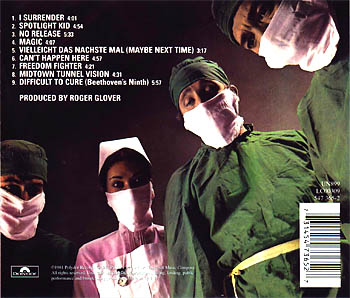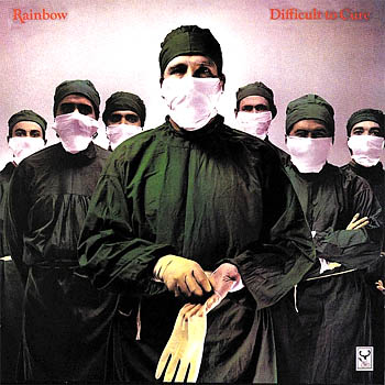 Zeven chirurgen kijken de patiënt dreigend aan op hoes van de zesde Rainbow-LP. Op de achterkant waant de kijker zich op de operatietafel, terwijl enkele medici zich zorgelijk over de patiënt buigen. Is de patiënt (de fan) ziek? Is hij echt "difficult to cure", moeilijk te genezen? Hoe reageert hij op de nieuwe Rainbow-LP, de operatie die de fan te wachten staat? Het resultaat van de operatie wordt hemzelf pas duidelijk als hij de plaat beluisterd heeft. De fan bepaalt zelf of de operatie slaagt of niet.VER(DER)GAANDE VERJONGING DIFFICULT TO CURE POLYDOR 2391 506 ![]() Het antwoord zal van Ritchie zelf moeten komen. Een Rainbow-LP is iets om reikhalzend naar uit te kijken. Oorspronkelijk was de plaat voor november gepland, maar de vertraging zal ongetwijfeld te maken hebben met de derde vokalistenwissel. De plaat is officiëel op 6 februari in ons land uitgebracht. Na de eerste luisterproef stond al vast: Blackmore heeft opnieuw verrast, hoewel dat eerst in negatieve zin was. Hoe je het ook bekijkt, de LP is anders dan we hadden verwacht. "D.T.C." is een plaat met verrassingen geworden. In eerste instantie beviel me de plaat helemaal niet maar het bleek dat de LP moet groeien. Nog nooit toonde een Rainbow-LP een zo grote verscheidenheid aan komposities. Veel elementen uit het verleden duiken hier en daar op, maar er worden ook nieuwe dimensies toegevoegd, die op "Down to earth" al te herkennen vielen en voortkomen uit de glasheldere produktie van Glover. Het verleden duikt op in "Spotlight Kid", dat een vervolg lijkt op "A Light In The Black". Behalve dat Rondinelli hier schittert alsof Cozy er nog steeds is, tovert Ritchie hier met Airey weer zo'n typisch Blackmore-riedeltje tevoorschijn, zoals we dat al kennen van o.a. "Burn", "Highway Star", "A Light In The B1ack", Ki11 The King, en van lang geleden "Wring That Neck" en "Mandrake Root". Het lijkt zo uit een turks/russische dans te zijn gehaald. Over de hele linie zijn de nummers kompakt gehouden, waardoor de spanning steeds gehandhaafd blijft. Lange soli worden vermeden. "Can't Happen Here" lijkt een zelfimitatie op "All Night Long" maar is gewoon een verbeterde versie van dat nummer. "No Release" is qua opbouw erg verrassend. Er wordt duidelijk afgeweken van de gebruikelijke couplet-refrein-couplet-refrein-solo-couplet-refrein-lijn. Aanvankelijk vond ik het a-capella-gedeelte hinderlijk, maar dan blijkt het een rustpunt te zijn voor de storm die meteen daarop wordt ontketend. "I Surrender", opnieuw van Russ Ballard, is veel akseptabeler dan "Since you been gone", dat te veel stokte en niet echt 'liep'. Vooral de vloeiende gitaarlijn maakt dat het nummer echt vlot 'loopt'. "Midtown Tunnel Vision" is als kompositie het 1ogische vervolg op "Love's No Friend" en "Mistreated". "Vielleicht das nachster Zeit" (Hé, Ritchie, muss das nicht 'das nächste Mal' sein?) is op zijn beurt een vervolg op "Weiss Heim", de engelse b-kant van "All Night Long", maar haalt toch niet het nivo van genoemd nummer. Het titelnummer, de bewerking van het slotkoor uit Beethoven's Negende Symfonie, wordt al sinds 1976 live gespeeld (eerst in "Still I'm Sad", vorig jaar in "Lost In Hollywood"). Nu dan de definitief op plaat gezette versie. Deze opname gaat verder dan de live-versie die ik gehoord heb. "Freedom Fighter" is qua kompositie niet zo sterk. De verveling dringt zich op als het refrein te vaak gezongen wordt. Tenslotte is er dan nog Moran's "Magic", dat is toch wel een dieptepunt, een absolute misser. Het is een raadsel hoe dit op een Rainbow-plaat terecht komt. Geeft Blackmore hier niet te veel toe aan de kommersjele eisen van de amerikanen? Tot zover het kompositorisch deel. ![]() Dan de muzikanten zelf. Het toetsenspel van Don Airey heeft nu een opvallender plaats gekregen in de Rainbow-sound. In het verleden vielen de toetsen nauwelijks op en hadden een puur begeleidende funktie. Op "D.T.C." vallen de heldere klanken wel op. Het TOTO-achtige piano-riedeltje heeft een duidelijke rol in "Vielleicht...", de melodische lijn in "Magic" wordt door de keyboards ondersteund. Ook in diverse andere nummers vult Don het groepsgeluid opvallend aan. De opvallendste rol speelt hij in het titelnummer, waarin de synthesiser voor een groot deel de rol van de basgitaar overneemt en Don's solo herinnert, aan goeie ouwe tijden. De rol van Roger Glover is al vaak bekritiseerd. Als bassist speelt hij geen opvallende rol. Ik ben er nog steeds van overtuigd dat zijn rol binnen Rainbow meer ligt in het terrein van arrangeur en producer. Maar dat doet hij dan ook met grote klasse. Dan de nieuwelingen. Bob Rondinelli was voor mij volledig onbekend, maar hij heeft me aangenaam verrast. Hij heeft weliswaar niet het loodzware bonkende geluid van Cozy, maar technisch doet hij niet onder voor Cozy. Hij s1aat in elk nummer wel één of meer prachtige breaks. In Bob heeft Ritchie een prima drummer gevonden. De meeste moeite had ik met Joe Lynn Turner. Ik was destijds enorm verrast door de reusachtige power en grote stembeheersing van Bonnet (hetgeen mij meteen tot een Bonnet-fan maakte). Joe Lynn zingt met een heel ander gevoel. Hij zit meer in de bluesy/soul~richting, zoals Coverdale die ook aan de dag legt. Je kunt het herkennen aan de vele kreten die soms midden door een een solo gehoord worden. Dat is iets dat mij nogal irriteert, net als bij Coverdale. Turner overtuigt toch, maar dat is te danken aan de inzet die hij toont; qua techniek haalt hij het (nog) niet bij Bonnet en Dio. Maar hij mag wel blijven. ![]() Een nummer als "No Release" heeft toch iets nieuws in zich. En verder is het toch een vertrouwd geluid. In Engeland gingen er nogal kritische stemmen op n.a.v. Roger's teksten op "Down To Earth". Ze zouden vrouwen vernederen en meer van dat moois. Op deze LP laat Roger zien ook andere onderwerpen aan te kunnen. Ritchie heeft Rainbow opnieuw verjongd. De groep klinkt fris en nieuw, terwijl dat nauwelijks te geloven is. Het lijkt een nieuwe groep en dat is in zekere zin 