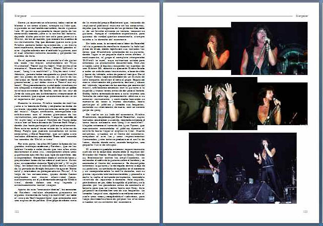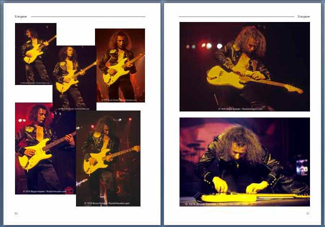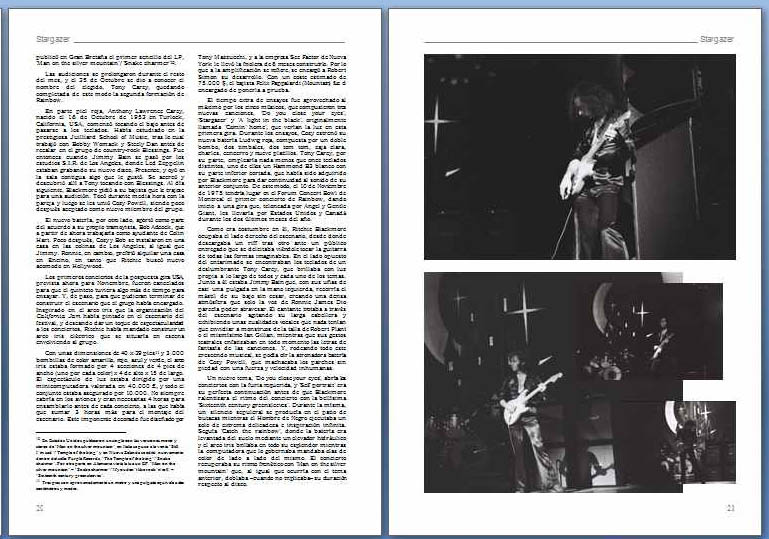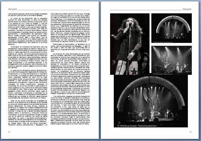 Stargazer 1975 - 2016 ![]() Ritchie Blackmore started a new musical venture in 1975 and he called it Rainbow. Along the next ten years the band issued some incendiary records that put its followers' mind on fire. After the band called it quits, they returned with big success in 1994 and, again, in the summer of 2016. Now, forty years after Rainbow was born, Jose Galván (Spain) with assistance of Frans van Arkel (Netherlands) has coordinated two dozen fanatics, some of them professional photographers nowadays, to play tribute to the band that changed their musical conceptions. All together they have created this new illustrated biography with pictures taken through the years by fans. Everybody, without any kind of hesitation, gave their images for free so this project came true. It wasn't difficult to convince them all: nobody will earn a single coin. This book is sold on cost price plus shipping. It's a labor of love made by fans to the real fans. What about the final result? More than 500 pictures along 268 pages on DIN-A4 format and double column text in Spanish wrapped in a hard paperback book. It's not an exceptional work but a book full of little mistakes, huge efforts, some family tragedies and the forge of a solid friendship among all who took part. Stargazer is a never to be repeated labor of love, and that's why it will be available only until the midnight of March 31st of 2018 (Greenwich time). After that term is concluded it will be definitely deleted. We just want to celebrate 40 years of Rainbow live music with everybody, diehard fans or not. And to make this book available we have opened a bank account number in order to simplify the necessary payment process. It will be printed on demand, but the price, € 60, doesn't cover the shipping cost so send an e-mail for the details. ![]() ![]() En 1975 Ritchie Blackmore, el guitar-hero por excelencia, puso en marcha un nuevo proyecto. Lo llamó Rainbow, y durante los siguientes diez años incendió las mentes de toda una generación con sus sucesivas entregas. Tras su disolución, el grupo regresaría a mediados de los noventa, y nuevamente tomaría los escenarios en el verano de 2016 ante el delirio de sus envejecidos seguidores. Ahora, cuarenta años después de su fundación, Frans van Arkel, desde Holanda, y Jose Galván, desde España, se han ocupado de coordinar a dos docenas de fans irredentos, algunos de ellos fotógrafos profesionales hoy día, para rendir homenaje al grupo que cambio su modo de concebir la música. De su esfuerzo conjunto surge esta biografía, ilustrada con imágenes tomadas año tras año por los admiradores del grupo. Todos los implicados, sin dudarlo un instante, han cedido los derechos de sus imágenes para hacer realidad este proyecto. No fue difícil convencerles: nadie obtendrá beneficio alguno, ya que el libro se vende a precio de coste más gastos de envío. Se trata de un libro destinado a los fans y hecho por los fans. ¿El resultado final? Más de 500 imágenes repartidas por un libro de 268 páginas en formato DIN-A4 (folio) y texto a doble columna. Además, optamos por una presentación más acorde con un tipo de lanzamiento como este, con mejor papel y encuadernación rústica (en tapa dura). No es una obra inmaculada, no obstante, sino llena de pequeños errores, grandes esfuerzos personales, algunas tragedias familiares y la forja de una solida amistad entre todos los participantes. Se trata de un libro singular e irrepetible y, justamente por eso, solo estará disponible hasta las 24.00 horas del 31 de Marzo de 2018 (hora británica), tras lo cual quedará definitivamente descatalogado. En efecto, porque nuestra intención ha sido siempre retirarlo del mercado una vez terminada la efeméride que se celebra con su publicación, los cuarenta años de la creación de una leyenda del rock. Y para la comercialización del libro hemos dispuesto una cuenta corriente en la que deberá realizarse el pago anticipado, puesto que el libro se imprimirá a demanda y no en tiradas sucesivas. El precio, 60 euros, tan solo incluye los gastos de impresión y encuadernación. Cualquiera que desee hacerse con una copia deberá primero ponerse en contacto con nosotros a través de la siguiente dirección de correo electrónico para conocer los detalles. ![]() ![]() |