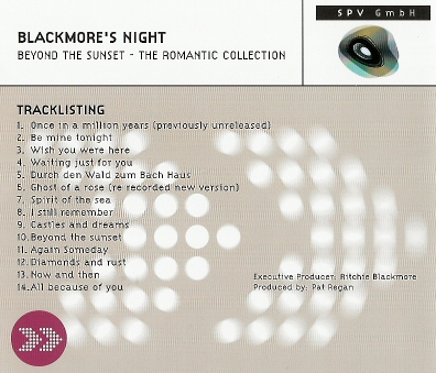 BLACKMORE'S NIGHT BEYOND THE SUNSET - THE ROMANTIC COLLECTION SPV 80000727 Promotional Copy ![]() It's not clear why recordcompanies always bring us compilation albums. It could be a way of giving new fans a collection of the best songs to know the band for a low budget price. But in these days of downloading music on the internet, not necessary the illegal way as many online shops and recordcompanies offer mp3 samples, it has become a bit useless to bring out a compilation album. So to make it a bit more attractive you get a bonus in the form of a new song, a multimedia track or even a bonus dvd. Here we have another Blackmore's Night compilation. We've seen some before, like "Minstrels And Ballads" (Released in Japan only, 2001) and "The Best Of Blackmore's Night" (Edel, 2003). That last one was nothing else than 17 songs from the first two albums put together on a cheap compilation by their former recordcompany Edel. So now we've got this compilation which is called "Beyond The Sunset - The Romantic Collection". As the title indicates it's a collection of their more quiet material. This promotional copy, which don't have the cover artwork yet, starts off with the only new song "Once In A Million Years". It's a very soft ballad. You would think this should fit very well on a Candice Night solo album. But with all of the Blackmore's Night albums in mind it's nothing more than very average at best. It could have been a nice Christmas Single, but the band already have another song recorded for that purpose titled "Christmas Eve". For the rest it's all known material of their 4 studio albums. It says there's a new re-recorded version of "Ghost Of A Rose", but you could have fooled me, this is very very similar to the original. For the rest there's the wellknown tracks like "Durch den Wald zum Bach Haus", "Wish You Were Here", "I Still Remember" & "Diamonds And Rust". ![]() More interesting is ofcourse the Bonus material which only will be added to the (limited) version. There's an audio Bonus CD with 3 Christmas songs which are all very sweet ballads. It starts off with "Emanual", there's some nice acoustic guitarwork from Ritchie here. "We Three Kings" comes closer to the Blackmore's Night sound we knew from their more quiet songs. The last track is "Christmas Eve", a very commercial mellow ballad with jinglebells sounds and all. This could become all of a sudden a hitsingle in a few months time when it's Christmas time. Now when it's still summertime with temperatures of over 25º C (that's about 80º F) it's a bit weird listen. Just like "Once In A Million Years" from the compilation album all these songs wouldn't misfit on a Candice Night solo album. But if this is the new direction Blackmore's Night is going in, it could make them loose more and more fans from Ritchie's past. On the other hand it also might open a market with many new fans. The most interesting bit of it all is ofcourse the Bonus DVD. It starts of with the audio menu in which ![]() ![]() ![]() 1. Once in a million years, 2. Be mine tonight, 3. Wish you were here, 4. Waiting just for you, 5. Durch den Wald zum Bach Haus, 6. Ghost of a rose, 7. Spirit of the sea, 8. I still remember, 9. Castles and dreams, 10. Beyond the sunset, 11. Again Someday, 12. Diamonds and rust, 13. Now and then, 14. All because of you Bonus DVD: 1. Written in the stars, 2. Morning star, 3. Play minstrel play, 4. Minstrel hall, 5. Under a violet moon Bonus CD Christmas Songs: 1. Emanuel, 2. We Three Kings, 3. Christmas Eve. ![]() by Yamaha Music in Japan only. 1. All For One, 2. Written In The Stars, 3. All Because Of You, 4. Writing On The Wall, 5. Under A Violet Moon, 6. Shadow Of The Moon, 7. Gone With The Wind, 8. Way To Mandelay, 9. Spanish Nights, 10. No Second Chance, 11. Rainbow Blues, 12. Waiting Just For You, 13. 16th Century Greensleeves (live), 14. All Because Of You, 15. Once In A Million Years, 16. Way to Mandalay (video bonus track). SPV Press Report BLACKMORE'S NIGHT BEYOND THE SUNSET - THE ROMANTIC COLLECTION STREET DATE: SEPTEMBER 13 - FORMAT CD OR CD/DVD FILE UNDER: ROMANTIC POP LABEL: SPV/STEAMHAMMER DISTRIBUTED BY: ZOMBA DISTRIBUTION OVERVIEW: Ritchie Blackmore is respected and admired the world over, not only for his exceptional talent as a guitarist and composer; his consistent approach to his own artistic ideals has also earned him the respect of both his colleagues and the media. In the early Seventies, Blackmore played the toughest rock music of that time with Deep Purple and later went on to devote himself to a more melodious style with Rainbow. Since the end of the Nineties, he has been concentrating on a contemporary form of medieval music that had already been shining through in numerous Rainbow compositions. "For me, that's the most wonderful kind of music. All those fabulous melodies, great arrangements and mythical atmospheres," he says. "I enjoyed my time with Deep Purple and Rainbow, but whenever we play one of our shows with Blackmore's Night, band, music and audience become one in a unique way. It's impossible to explain the feeling that runs through a musician at times like that. It's absolutely awesome." Beyond The Sunset - The Romantic Collection, a compilation of the most beautiful BLACKMORE'S NIGHT ballads to date, is a kind of summary of the first four studio recordings by Blackmore and his partner, Candice Night. "We call this record our 'wedding album', because friends and fans have told us that they play these songs as background music at weddings," Candice Night explains the idea behind Beyond The Sunset. "Ritchie and I have played these songs ourselves at friends' weddings. They've always told us that the quiet material is perfect for those occasions." The collection features a total of fourteen tracks, among them a re-recorded version of 'Ghost Of A Rose' and emotional numbers like 'Be Mine Tonight', 'Spirit Of The Sea', 'I Still Remember' or 'Diamonds And Rust'. The album is rounded off by a remi