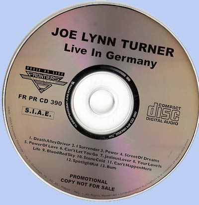 JOE LYNN TURNER LIVE IN GERMANY Frontier Records FR PR CD 390 Promotional Copy ![]() Joe Lynn Turner did a few dates last year in both the US and Europe after releasing his "Second Hand Life" CD. The last date of the tour was in Ludwigsburg, Germany on the United Forces of Rock festival. Now one year later this show is released as a live CD. It's Joe Lynn Turner's first solo live album. The line-up of Joe Lynn Turner's band for this concert: Joe Lynn Turner (vocals), Greg Smith (Bass / Backing Vocals), Mike Sorrentino (Drums), Carmine Giglio (Keyboards) and Karl Cochran (Guitar / Backing Vocals). JLT is together here with a fine bunch of musicians. Greg Smith is ofcourse best known for his stints with Rainbow and Alice Cooper. Nowadays he's on the road with wildman Ted Nugent. He was also in the band for Billy Joel Broadway show "Movin' Out". The drummer in that last band at the time is Mike Sorrentino who also has been in Blackmore's Night in the past. Keyboardplayer Carmine Giglio has also been part of the "Movin' Out" band and Blackmore's Night. And Karl Cochran is especially known for his excellent guitar work on JLT's studio albums. ![]() After the opening song the party goes on with many Rainbow classics from the past. "I Surrender", "Power" and "Street of Dreams" are next. All very striking versions. Joe sing like in his Rainbow days, Karl Cochran play great and give us a few excellent guitar solos, Carmine Giglio let us hear some very sparkling keyboards and the backing duo Greg Smith and Mike Sorrentino play tight and heavy. From JLT's solo album "The Usual Suspects" we get "Power of Love". And there are 2 tracks from "Second Hand Life" with "Your Love is Life" & "Blood Red Sky". All great songs that fit in excellent between all the Rainbow material. Ofcourse we also get to hear all those killer ballads from the early 80's including "Stone Cold" and "Can't Let You Go". The last one with a superb intro by Carmine. More Rainbow stuff with the rocker "Can't Happen Here" and also the surprising "Jealous Lover" (which was a B-side single for "Can't Happen Here") is played. A great version of "Spotlight Kid" with again some great guitar and keyboards is the last of 9 Rainbow songs. JLT tell the Germans to wake up and ends the show with Deep Purple's "Burn". Some good backing vocals by Greg Smith on this one and Karl is very impressive on this track too. This live CD is a must have for JLT fans as well as the fans of the JLT Rainbow era. There's almost 75 minutes of great music. No less than 9 Rainbow tracks. Besides there are songs from JLT's solo albums and a Deep Purple classic. We know the qualities of JLT and the man proves it again here to us. And he has here a band with top musicians. Great axeman, excellent bassplayer who also can sing backing vocals very well, fine basher behind the drums and a real keyboardwizard. Releasedate: October 10, 2008 (Frontiers Records) Rating: ***** (5 out of 5) |