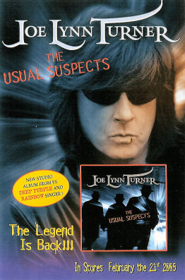 JOE LYNN TURNER THE USUAL SUSPECTS Frontier Records FR CD 230 Promotional Copy ![]() ![]() This album has 11 great songs that sounds a lot like Rainbow in the 80's when Joe was in the band. It's by far the best solo album of Joe so far, even if he'd some pretty good albums out in the past. The Rainbow element is only reinforced by the presence of ex-Rainbow members John O'Reilly & Paul Morris. It starts with the great rockin' "Power of Love". A very catchy rocker, followed by other good rockers like "Devil's Door" and "Jacknife". Ofcourse there are some excellent AOR ballads. "Really Loved" is the best ballad on this album, it's in the vein of excellent Rainbow hits like "Stone Cold" and "Street of Dreams" with a touch of Foreigner. This song could be a top 10 hit. It should be.... But also the other 2 ballads on this album, "All Alone" and "Live And Love Again", are top songs. Joe certainly know how to handle ballads. The best songs are "Into The Fire (not a cover of the Deep Purple track) and "Blood Money". These two wouldn't have done bad on a Rainbow album. The guitar solo in "Blood Money" by Karl Cochran just sounds like the Man in Black in his best days. The last track is a bonus track for the European market "Unfinished Bizness". On the Japanese release there's a different bonus track called "What I Can Do" Unless you refer to JLT as the "Squeely One", just go and buy this album because you won 't get disappointed. Releasedate: February 21, 2005 in both Europe (Frontiers Records) & Japan (Yamaha Music) Listen to samples of all the songs: - European version including bonus track "Unfinished Bizness" - Japanese version including bonus track "What Can I Do" |
