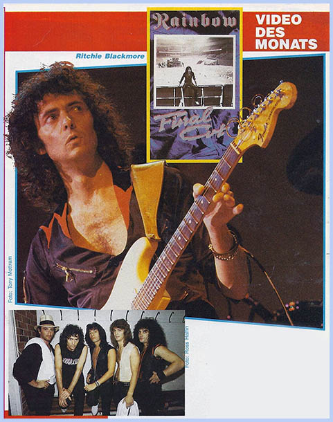 RAINBOW THE FINAL CUT Polygram Video of the Month ![]() The true Blackmore disciples will have tears in their eyes once again: The credits of "The Final Cut" look like the definitely demise of a band, whose maestro is blessed with a never-ending fountain of creativity. To anticipate it right away: The absolute highlight of this 60-minute video is the live recording of "Difficult To Cure", in which the manic Ritchie fulfills his dream. Rock Meets Classic again: Our hero quotes with a full symphony orchestra behind him Beethoven's Ninth in many variations and plays in such ecstasy that the viewer cannot stay seated without being grabbed by the scenery. Further live recordings are the opener "Spotlight Kid" and the fiery "Power", both of which come from the "Straight Between The Eyes" tour. Otherwise, songs are lined up, which, in addition to the music made visible, also roughly illustrate the recent history of the video clip: from mere filming of a playback performance ("All Night Long", "Since You've Been Gone") to towards the lavish short film "Street Of Dreams", which is also meaningful in terms of content). "The Final Cut" is limited to the Rainbow phase from 1978 with Graham Bonnet and Joe Lynn Turner as singers. Dio is completely dispensed. This does not detract from the attractiveness of the video - especially because most clips in Europe have hardly been played, so far only on some cable station - a must for Rainbow fans! Reinhard Harms, Metal Hammer Magazine, Germany 1986 |