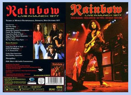 On August 21 at last the Rainbow "Live in Munich 1977" DVD has been released in Europe. The release in the US will be on August 22. The DVD has been put on 1 DVD-9 where the Japanese version, released already last December, was done as a double DVD. Is there less on this DVD? No! There's even a little extra in the form of a commentary track of 40 minutes. This includes a history based mainly on the Dio era told over some screencaptures of the Munich 1977 gig. It's a nice little extra.