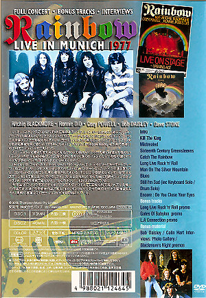 The first disc is the full live concert filmed by Rockpalast on October 20, 1977 in the Olympia Halle in Munich, Germany. The show was originally scheduled for the 19th, but as Ritchie was arrested the night before in Vienna it was postponed one day.