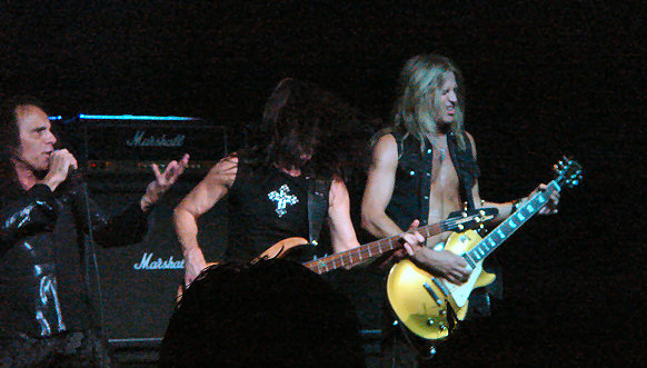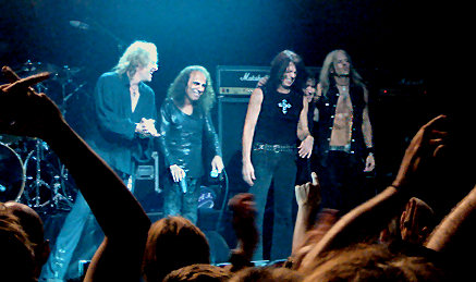 Tonight Ronnie James Dio did the first show of the second part of the European Tour in Eindhoven (The Netherlands). The first part lead Ronnie and his band through Eastern Europe including shows in Russia, Ukraine, Belarus and Poland. The last few shows had some weird reviews telling Craig Goldie was drunk on stage and playing pretty badly. Finally it was cleared up that Craig was suffering from Carpal Tunnel Syndrome, which gave him so much pain in the end that he couldn't finish the tour. ![]() At 20.45 the houselights goes out and the intro started. The band (minus Ronnie) enters the stage and Doug kicks off the awesome riff to "Tarot Woman". What a way to start a concert. The rest of the band joins in and then the small singer with the huge voice walks the stage. The crowd goes wild right from the start. Simon Wright is hitting his drums very powerfull, just like Cozy Powell did in the old days. Rudy Sarzo shows his reputation of wild man of rock'n'roll. Scott Warren plays pretty well with an angry look on his face. Doug Aldrich shows right away that he is one of the new guitarheroes. ![]() The audience gets a splendid version of "Tarot Woman", that is followed by "The Sign Of The Southern Cross" and "One Night In The City". After these 3 songs it has become time for the full "Holy Diver" album. First there is a 5 minute movie projected, then the band plays the complete first Dio album. They kick off with "Stand Up And Shout". After "Holy Diver" and "Gypsy" it is time for Simon Wright to do his solo. Simon already made in a very good impression in the first few songs. A very good powerfull heavy drummer. He shows his skills in his solo, that ends with Simon drumming backed by orchestral music. More from the "Holy Diver" album follows with the poppy "Caught In The Middle", the very good "Don't Talk To Strangers", the rockin' "Straight To The Heart" and the surprising "Invisible". "Rainbow In The Dark" makes the crowd even wilder. ![]() ![]() After the fine "Shame On The Night" it's time for some more solo's. First off is Doug Aldrich. Although I think Craig Goldie is still the best guitarplayer for Dio, Doug did a marvellous job this evening. He's really one of the upcoming guitarists of today. ![]() Then Ronnie returns also back on stage for a reprise of "Shame On The Night". To end the complete "Holy Diver" album, there's also a reprise of the titletrack. They continue the show with some real killer tracks. First there's one of Rainbow's Long Live Rock'n'Roll album, "Gates Of Babylon". Ronnie sings like a God again. Rudy Sarzo seems to have the time of his life, going totally crazy. And Doug plays a splendid solo. There's one more in the set, Black Sabbath's "Heaven And Hell". Again we get a great version of a true classic metal song. The band is top class and then it's all over. But not for long. The band returns with a steaming version of "Man On The Silver Mountain". And there's another Rainbow song with "Long Live Rock'n'Roll". The crowd's totally wild and singing along. The first encore ends with "The Last In Line". The band thanks the audience and leave the stage. But once more they return. With a rockin' version of "We Rock", the band gives it all one more time and then it's over. Ronnie trips over the mikestand, Rudy laughs his head off and after the bands thanks the audience once again the houselights goes on and the party is over. Setlist: Intro Tarot Woman The Sign Of The Southern Cross One Night In The City ![]() Stand Up And Shout Holy Diver Gypsy Drums Solo Caught In The Middle Don't Talk To Strangers Straight Through The Heart Invisible Rainbow In The Dark Shame Of The Night Guitar Solo - Keyboard Solo - Instrumental Jam Shame On The Night (reprise) Holy Diver (reprise) Gates Of Babylon Heaven And Hell 1st encore: Man On The Silver Mountain Long Live Rock N Roll Last In Line 2nd encore: We Rock |