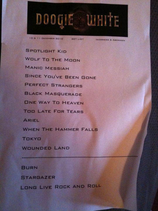 Doogie White Mad Hatters, Inverness, Scotland UK December 10, 2010 Got home late last night from my first shows with Doogie White at the weekend. We were all delighted with the shows and the opportunity to perform and play with Doogie so much over the weekend was teriffic. We performed two shows as well as an acoustic set which was filmed and broadcast on Moray Firth Radio. The Acoustic set included the DIO era Rainbow classic "Temple Of The King", the Coverdale-Deep Purple track "Soldier Of Fortune" and the ROADWAY/Doogie White track "This Is Why". The Inverness show especially was fantastic, playing such an amazing set to a home crowd was a whole new experience and something I'll remember for a long time. Doogie and the guys were a delight to work with and I think we all did a good job. The set list included tracks from every era of RAINBOW (DIO, Bonnet, Turner, White) as well as a few Deep Purple classics and some of Doogie's post and pre RAINBOW material. So what's next?... well I'm delighted to announce that this line-up of the Doogie White band will be performing again in Summer 2011 on a Scottish tour which has yet to be confirmed, no dates or plans are able to be released yet, just that Doogie, myself and the guys are looking forward to performing again and working together on more shows next year. Any plans, or confirmed dates will be announced here FIRST, so please keep checking back throughout the year and I'll update the site with any new developments. Ross McEwen www.rmmonline.net ![]() ![]() ![]() ![]() © all pics taken by fans at Inverness, Scotland show, December 10th, Mad Hatters Thanks to: Ross McEwen |