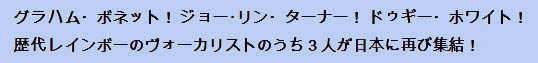 Voices of Rainbow Special Live in Japan 2013 ![]() Nakano Sun Plaza Hall, Tokyo, March 12 - 7 pm (Tue) The Bottom Line, Nagoya, March 13 - 7 pm (Wed) Umeda Club Quattro, Osaka: March 14 - 7 pm (Thu) ![]() (Translated as): Graham Bonnet! Joe Lynn Turner! Doogie White! Three of the former Rainbow vocalists gather again in Japan! The announcement from the Tokyo Onkyo Rock Site says it all. Having missed the first series of concerts performed there in late September 2010, I certainly wasn't going to miss these concerts for the world. Luckily when I arrived into Japan on March 9th, I had a few days to adjust to the 16 hour time difference and take in some much desired sightseeing of the entire Kansai District in the company of my longtime Japanese friend, Nami Hayashi. One thing I could not adjust to, however, was the wintery-like conditions during my stay. Conditioned to the hot and dry weather here in central Arizona, early spring in Japan felt more like being in Seattle and Chicago on a cold winter's day, except without the snow. With temperatures ranging from 0 to 5 Degrees Celsius (32 - 37 Degrees Fahrenheit) in the early morning and late at night - coupled by spurts of intermittent rain and strong winds - made for quite an adventure trying to stay as warm as I could, while me and my friends made our way from venue to venue - by foot, subway, JR Rail, Shinkasen ("Bullet Train"), and in one rare occasion, by taxi. But once inside, the music was all that mattered. 12th March 2013 Greeted by a long staircase leading into the Nakano Sun Plaza Hall, the first thing the audience heard playing from the towering stack of speakers placed on either side of the stage were the songs from the solo career of the late great Ronnie James Dio. He was Rainbow's original lead vocalist who had succumbed to stomach cancer in May 2010. The playing of his music certainly would set the tone for these three 'Special Live' concerts. While I was toiling away at setting up my shots during the show, I tended to ignore the music a bit, so I enlisted the help of John Pedder to help me recall the events of the first night. John is a friend of Doogie White's from the UK who now resides in Dubai. He and Doogie, who had not seen each other in a long time, reconnected at the Tokyo show on March 12th. "The show itself was far better than I had dared hope for. Nakano Sun Plaza Hall is an excellent venue with over 2,000 seats, which were suitably, full for this show. For the show that night the auditorium was equipped with very nice stage lighting & a decent sound system too. We were all set. Joe Lynn Turner kicked off the evening in fine form & chose some excellent songs that I had not heard for many-a-year. He delivered a very strong show backed with that well chosen (& somewhat familiar Japanese band fronted by Akira Kajiyama - remember Hughes Turner Project amongst others?). Standout cuts for me were 'Spotlight Kid' (the definitive Rainbow opener) and 'Power' - a fantastic commercial rocker of a song that should have been a hit single back in the day. Other classics included 'Can't happen Here' & of course 'I Surrender'. A winning performance by a real professional & a very nice guy too! ![]() ![]() Doogie White hit the stage with a hard rocking set supported by his chosen songs which were a real treat too - 'Wolf to the Moon' & 'Black Masquerade' are lost Rainbow classics from the 'Stranger in Us All' album. The set as a whole & Doogie's style hark back to the original Rainbow era & it was a nice contrast to Joe's sound. A tribute to the late, great Ronnie Dio in the form of 'Catch The Rainbow' featured an epic performance from Doogie. Ronnie would have approved. Doogie seemed to be having a great deal of fun & why not?! He started out as a fan of the guys he has played with in various bands with & continues to do so. Nice work! Joe & Doogie chose to close with 'Burn', as a powerhouse duet. What a great song & an inspired choice. A great finish from a real gent & a very fine singer. ![]() Alcatrazz featuring Graham Bonnet - what can I say? Ace. Opening with 'Assault Attack' from the self-titled MSG album proved a worthy statement of intent & demonstrated that the band & its esteemed front-man were in fine form. Several Rainbow staples appeared during the set including the magnificent 'Loves No Friend' from 'Down To Earth' with Graham seemingly almost bursting a blood vessel. Fortunately he didn't! I was hoping for my all-time favorite Alcatrazz song to get an airing & I was not disappointed. 'Will You Be Home Tonight?' from 'Disturbing The Peace'. Oh yes, they played it. It was worth the trip to just hear that. Mission accomplished. It was a real pleasure hearing 'Dancer' from MSG which ably showed just why Graham was enlisted into MSG. Commercial rock at its best (a'la Rainbow) & another lost classic. To hear 'Only One Woman' sung was a moving experience for Graham (& the audience) so soon after Trevor Gordon's passing away (Graham's cousin & the other half of the Marbles) . Graham's vocals were very strong throughout displaying an amazing commitment to full-on delivery on every song. Not too shabby for a man in his sixties!" A brilliant night." ![]() ![]() 13th March 2013 The road show moved to a club in Nagoya called 'The Bottom Line'. It was there where conditions for shooting the show weren't as accommodating as the previous night, but luckily I was able to get on the club's balcony to get the best vantage point. My concert reviewer from the night before had already boarded a plane back home, so he missed one of the highlights on this night--JLT's 'Can't Let You Go'. I always loved the recorded version and the video of the song from the "Bent Out of Shape" album; but, in hearing it live, vocally it can be a hit or miss with him, especially in these later years because of the demand this song has on his vocal range, but on this night, Joe simply nailed it. Another highlight was during Doogie and Graham's encore perfo