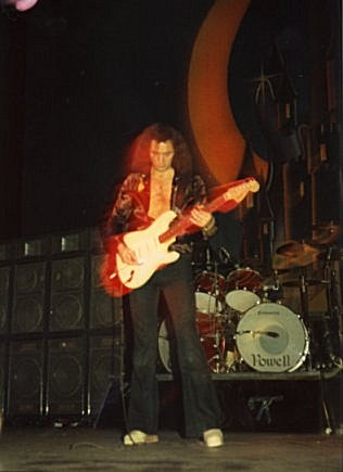 To many Deep Purple fans, Ritchie Blackmore had been the essence of that band. This feeling had been reinforced by the groups lacklustre gigs with his replacement Tommy Bolin. Rainbow's shows were thus eagerly awaited and people were keen to see what Blackmore could deliver given a free musical reign. The fans faith was to be amply rewarded. Blackmore's total musical control gave him a freedom on stage he had never really had before, and while the set remained constant, he was able to develop and change the structure of the tracks as he so wished. The net result was guitar playing which reached new heights, with solo's stretched out or curtailed as the mood took him, running the spectrum of emotions from gentle runs to intense riffing. At many gigs audiences were reduced to absolute silence in which you could of heard the proverbial pin drop as Blackmore went off into the outer reaches during 'Catch The Rainbow'.
